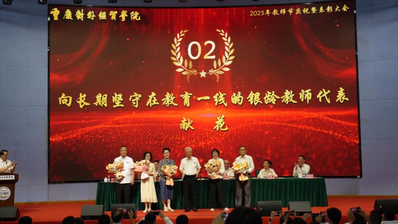 副校长周明星通报2024-2025学年度获市级表彰团队及个人名单并为其代表颁奖;副校长王婕宣读2024-2025学年度优秀教师、优秀辅导员和优秀教育工作者的表彰决定,并为代表们颁奖;副校长李川宣读2025年教师课堂教学大赛获奖名单并为其代表颁奖。