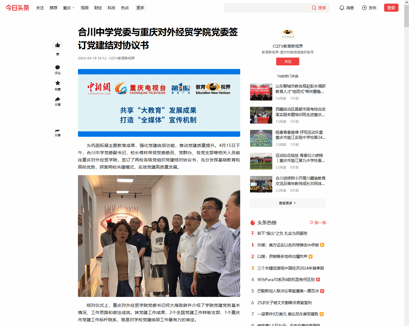 【今日头条】报道合川中学党委与英国威廉希尔唯一官网党委签订党建结对协议书