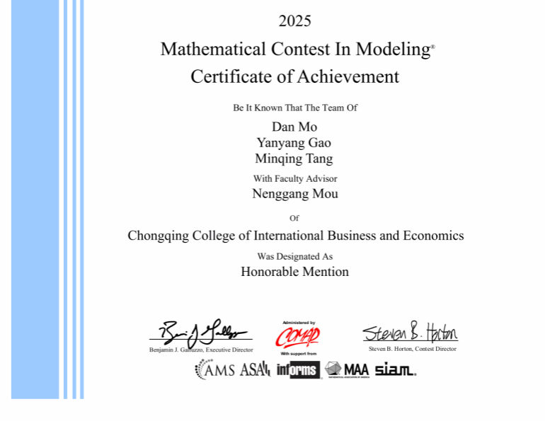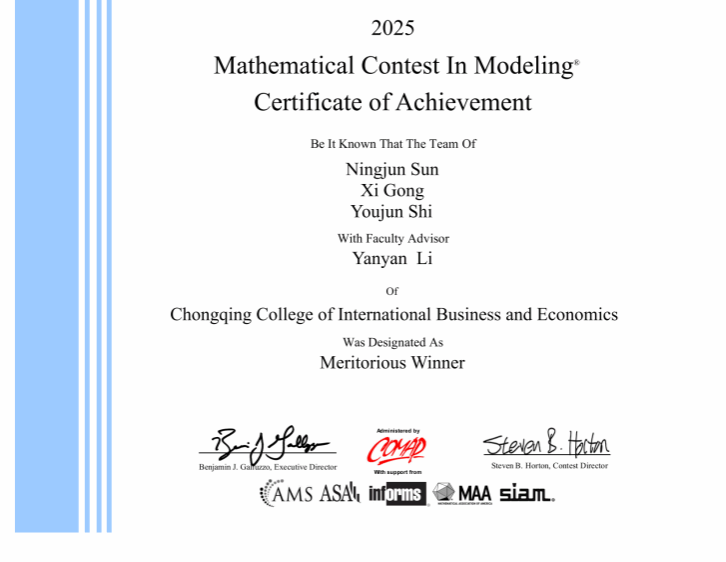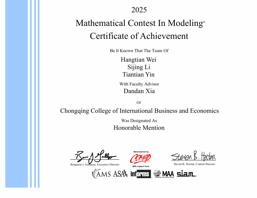 尤为值得一提的是,此次荣获的国际一等奖(M奖),是威廉希尔官网在该项赛事中首次实现国际一等奖的重大突破。这一里程碑式的成就,不仅彰显了威廉希尔官网学子在国际学术舞台上的强劲实力与无限潜力,更刷新了威廉希尔官网在该项权威赛事中的历史最佳成绩,为学校在该赛事的荣誉簿上书写了新的篇章!