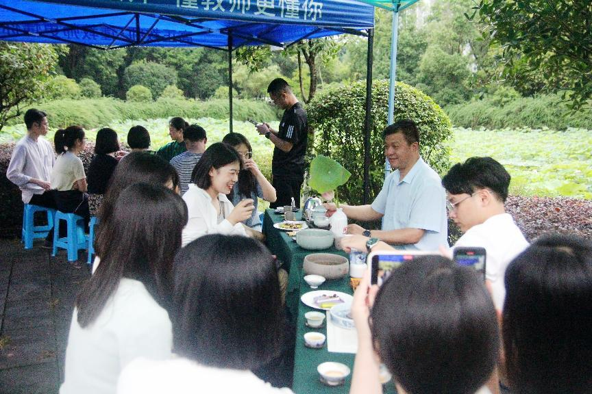 为丰富广大教职工文化生活,校工会茶艺小组于6月15日14:00在合川A校区荷花池中心小岛开展了“围炉煮茶、品茗赏荷”茶会活动,常务副校长王乃武莅临茶会现场,近20名教职工参与品茗活动。