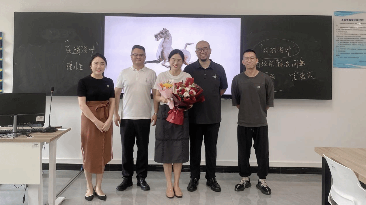 院长朱亚明、副院长马乐、工会主席彭丽、办公室主任易欣与教师合影