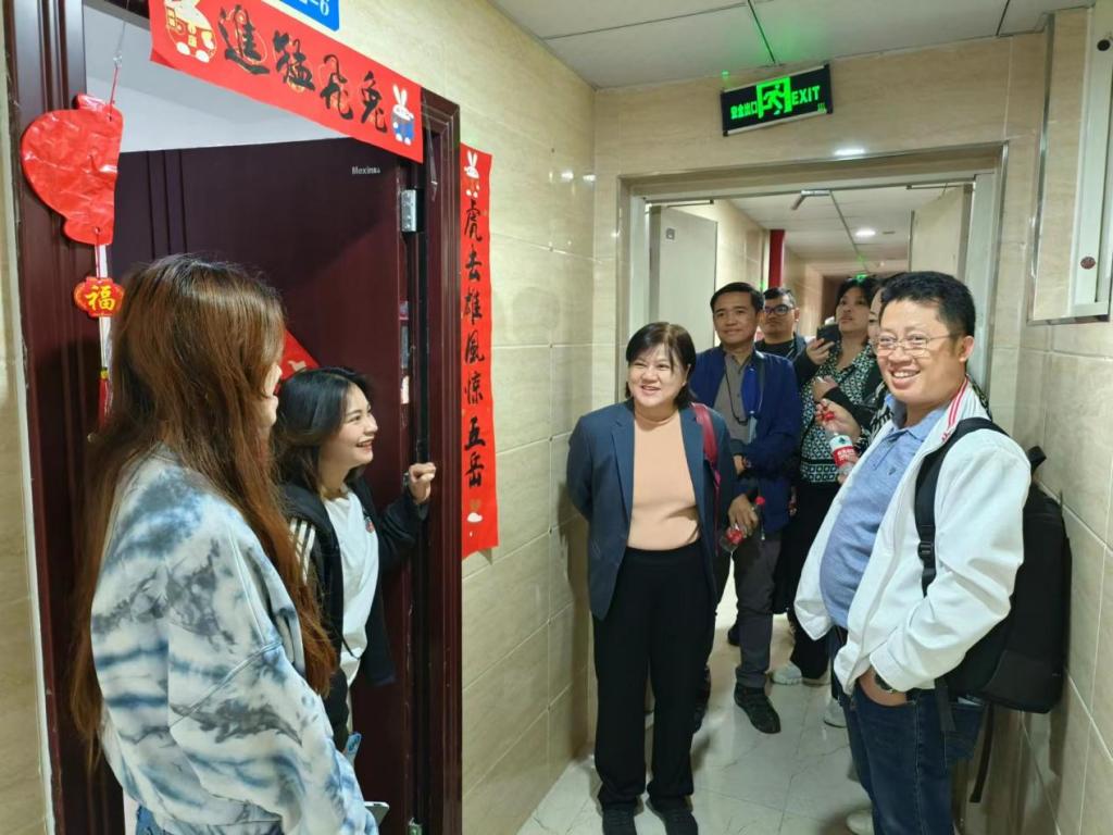 会前,卡妮莎校长一行由校领导陪同参观B校区,了解智慧校园、后勤服务等建设情况,并看望在校泰国留学生。
