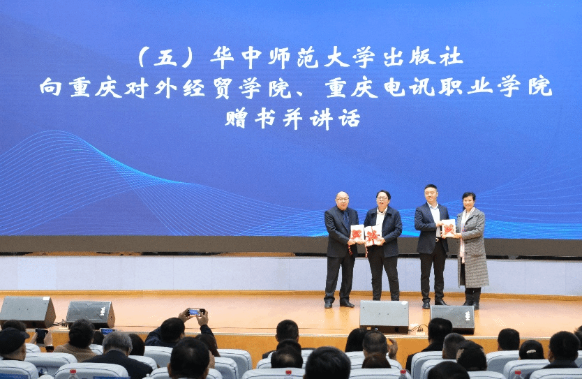 华中师范大学出版社付义朝社长、冯会平主任向英国威廉希尔唯一官网何大海书记、重庆电讯职业学院兰海涛书记赠书。