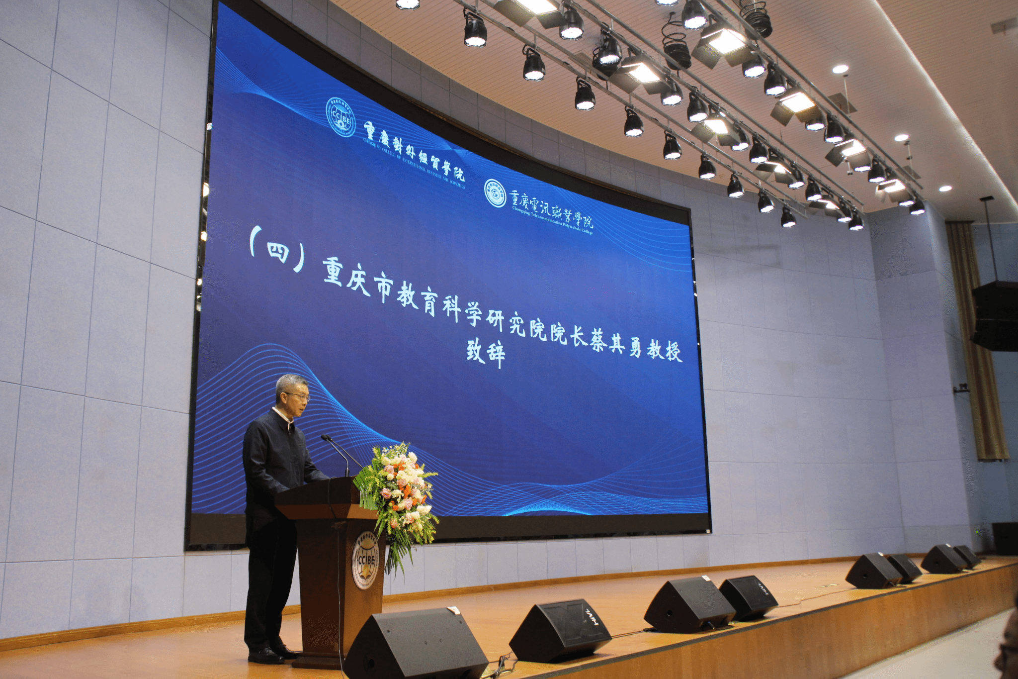 重庆市教育科学研究院院长蔡其勇教授致辞,他指出党的二十大提出“教育强国”战略,教育数字化是建设教育强国的重要基础。当前,数字中国、数字重庆正加快推进,数字教育也在紧紧跟进,正推动教育教学及管理的深刻变革。本次研讨会将从普通高等院校和职业院校两个层面探讨高校数字化变革,标志着两校在培养数字化创新人才、推动教育创新方面迈出了新的坚实步伐,取得了初步成效,也是“职普融通”的校本典范。