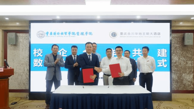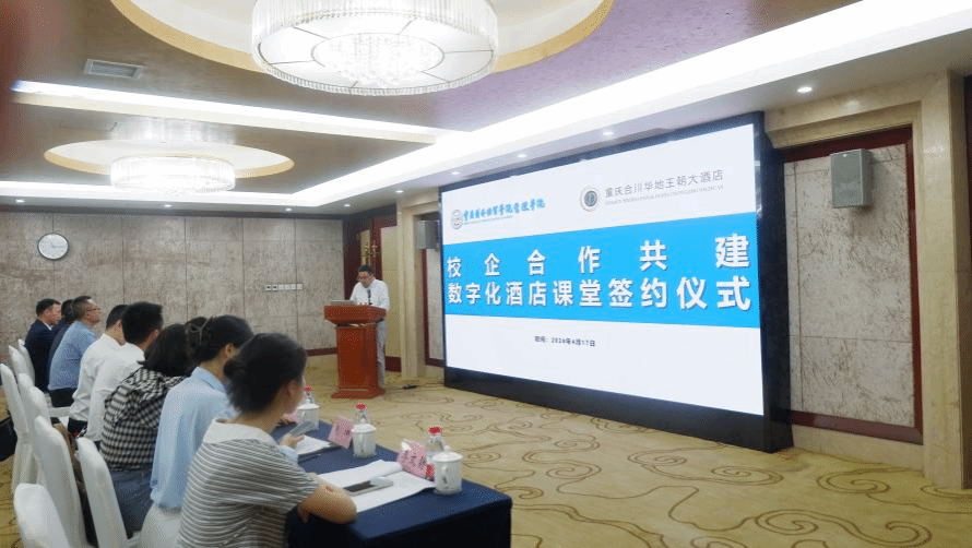 2024年4月17日,学校与重庆合川华地王朝大酒店在华地酒店会议中心举行共建“博士后科研工作站数字化酒店课堂”签约授牌仪式。副校长周明星、科研处处长彭成、管理学院党总支书记周万春以及管理学院师生代表,集团分管酒店领导郭剑、易德智,华地王朝酒店总经理刘世华、集团运营总监赵峰等出席签约授牌仪式。仪式由管理学院院长陆林教授主持。