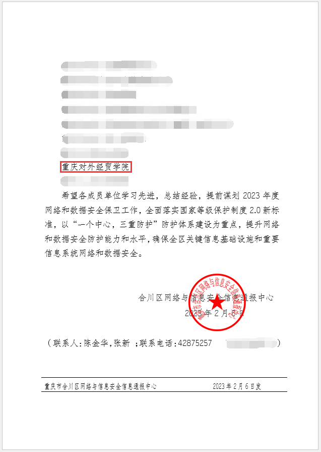 近日,合川区网络与信息安全信息通报中心发布《关于2022年度网络与信息安全先进单位的通报》(渝合网通〔2023〕5号),学校获评“2022年度网络与信息安全先进单位”称号,这是学校继2020年获评之后,再次获此殊荣。
