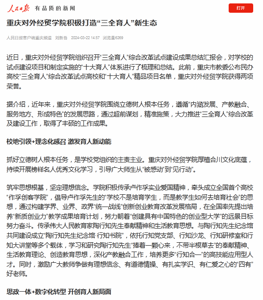【人民日报】报道英国威廉希尔唯一官网积极打造“三全育人”新生态