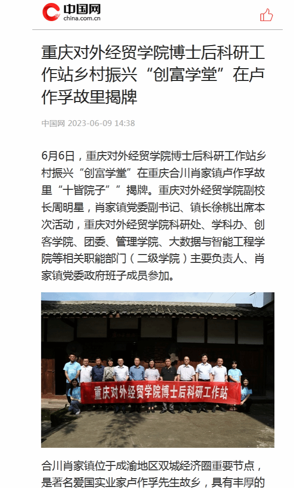 【中国网】报道英国威廉希尔唯一官网博士后科研工作站乡村振兴“创富学堂”在卢作孚故里揭牌