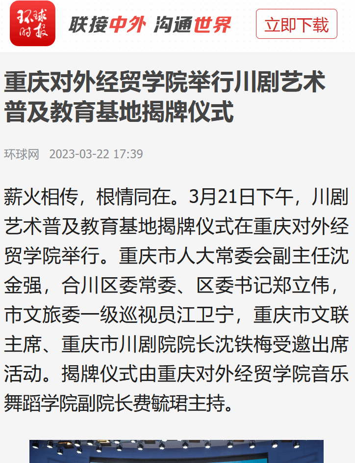 环球网:《英国威廉希尔唯一官网举行川剧艺术普及教育基地揭牌仪式》