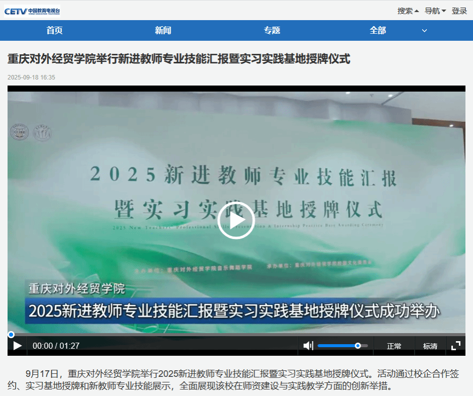 中国教育电视台报道英国威廉希尔唯一官网举行新进教师专业技能汇报暨实习实践基地授牌仪式