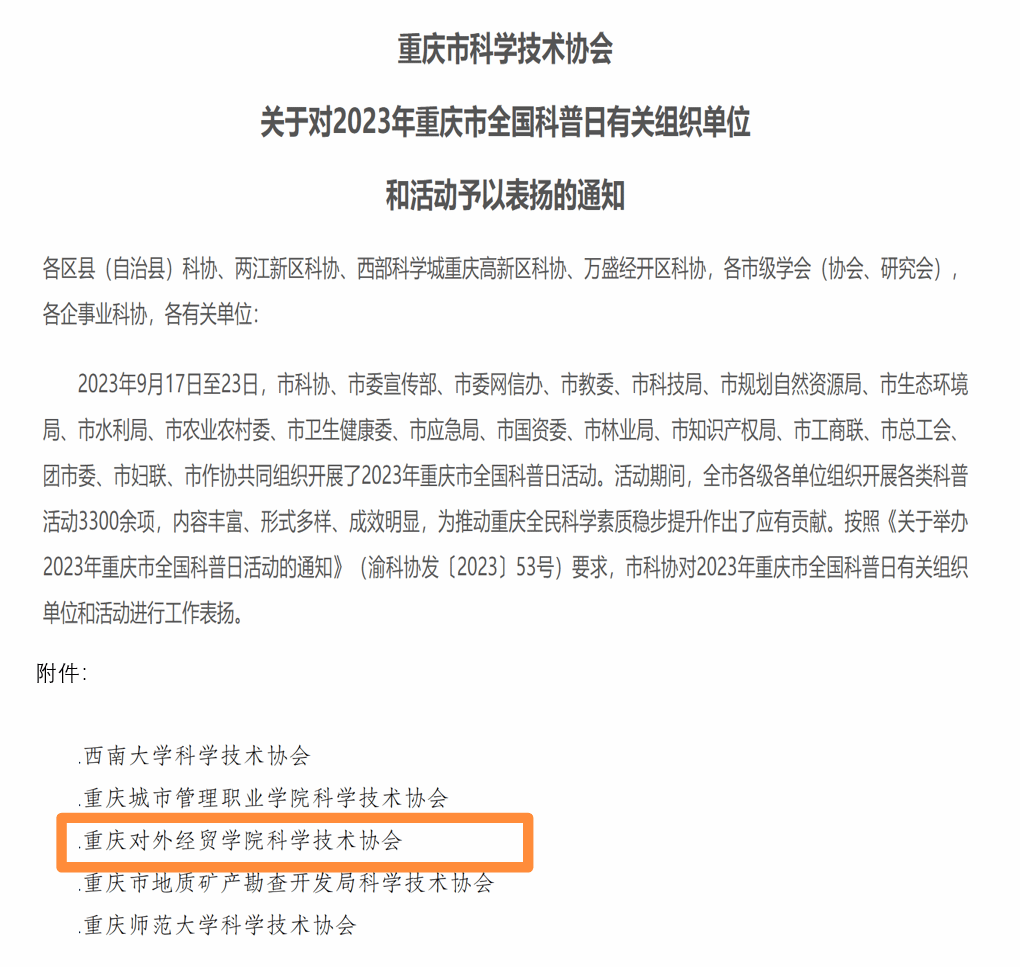 2023年12月12日,重庆市科学技术协会印发《关于对2023年重庆市全国科普日有关组织单位和活动予以表扬的通知》,对2023年重庆市全国科普日活动内容丰富、形式多样、成效明显的单位和活动进行通告表彰,学校科学技术协会荣获2023年重庆市全国科普日活动优秀组织单位。