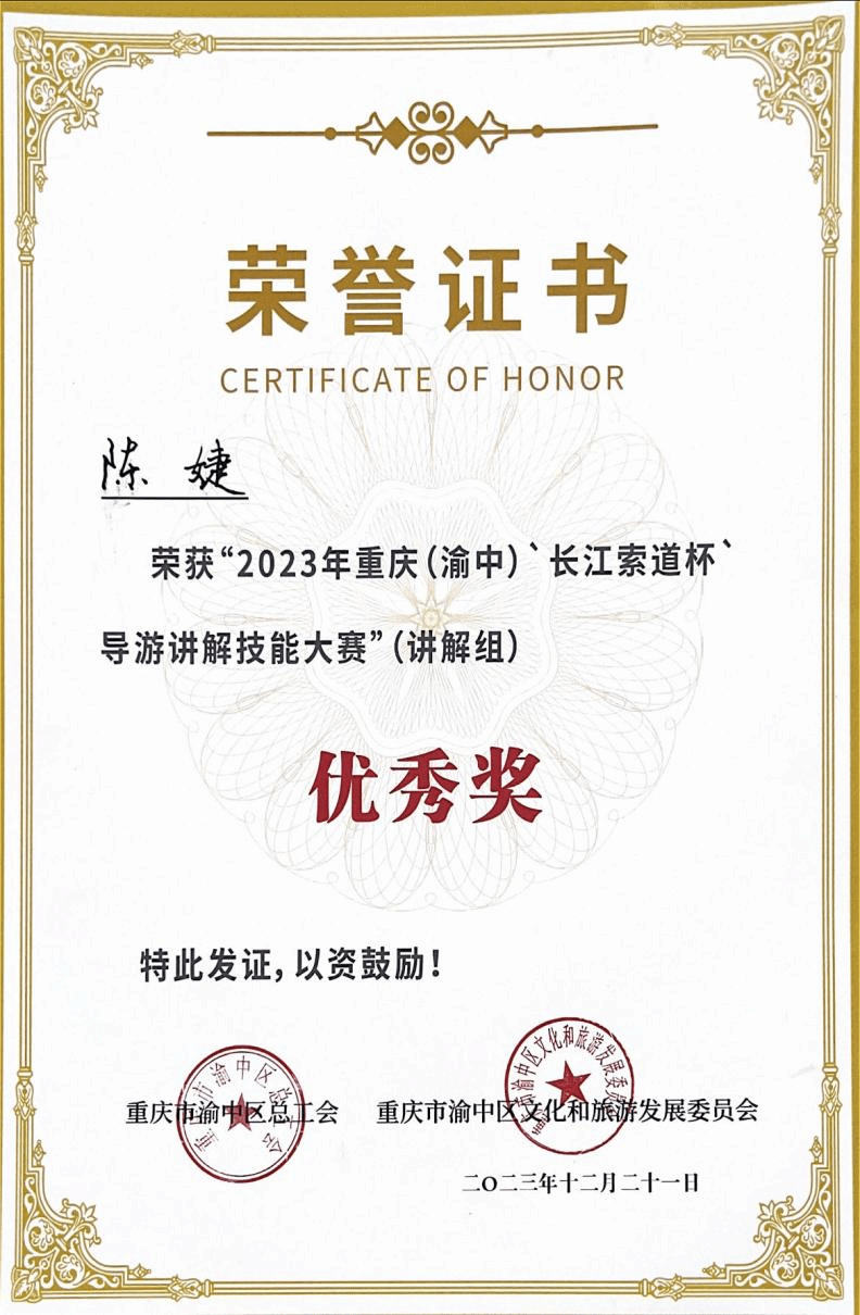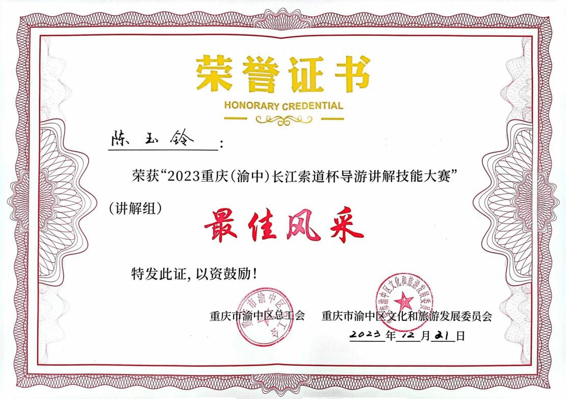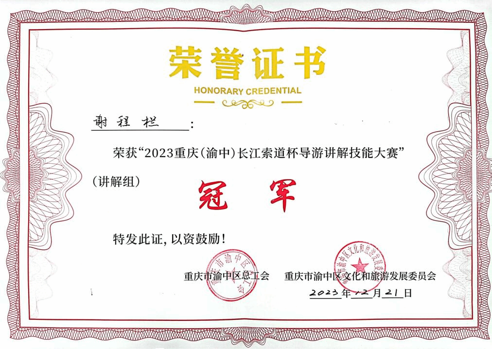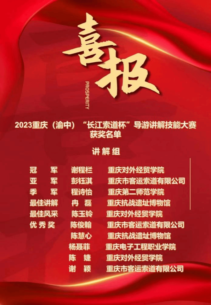 经过一周紧张严密的准备,在79名专业讲解员和各校优秀学生的复赛角逐中,谢程栏、陈玉铃和陈婕三名学生以声色并茂的讲解获得评委老师青睐,冲进赛事前十,获得参加决赛的资格。12月21日,在重庆长城酒店举行的2023重庆(渝中)“长江索道杯”导游讲解技能大赛决赛中,经过激烈刺激的比拼,学校谢程栏同学荣获大赛第一名,陈玉铃同学荣获“最佳风采奖”,陈婕同学荣获大赛“优秀奖”,英国威廉希尔唯一官网荣获“最佳组织奖”。