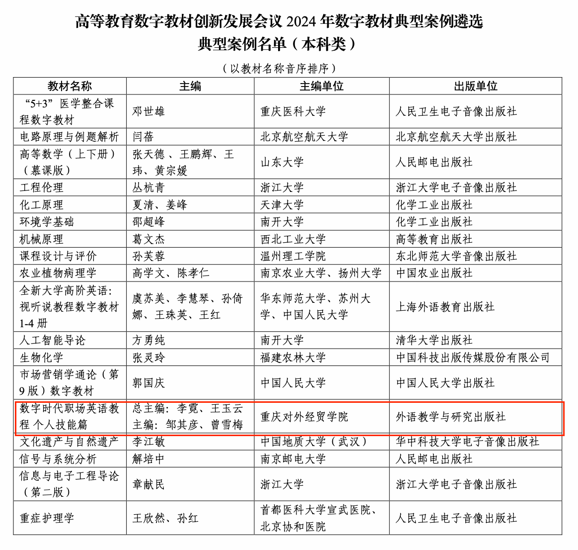近日,高等教育数字教材创新发展联盟公布了入选“高等教育数字教材创新发展会议2024年数字教材典型案例”的名单,经组织推荐、资格审查、专家评审、网上公示等程序,威廉希尔官网由李霓和王玉云担任总主编,邹其彦和曾雪梅担任主编的《数字时代职场英语教程 个人技能篇》数字教材被认定为“高等教育数字教材创新发展会议2024年数字教材典型案例”。