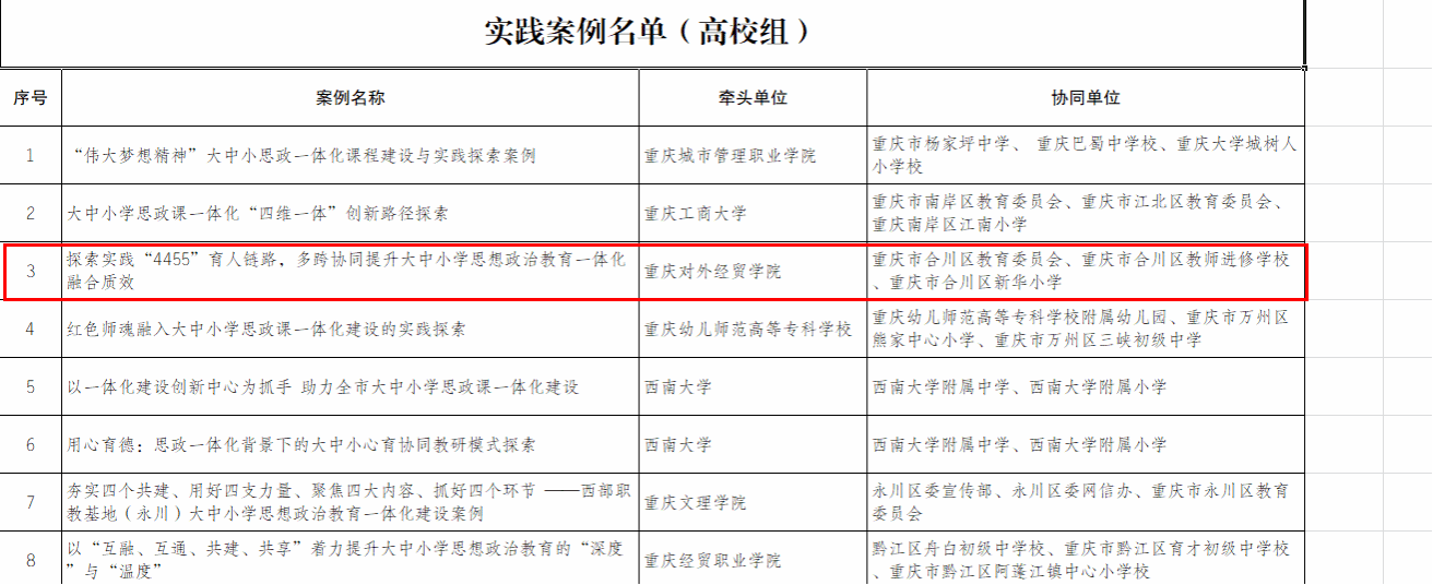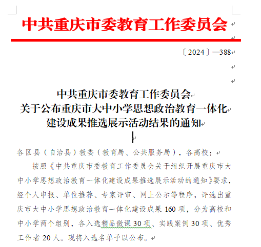 5月23日,重庆市教委公布“重庆市大中小学思想政治教育一体化建设成果推选展示活动”名录,威廉希尔官网推选的《探索实践“4455”育人链条,多跨协同提升大中小学思想政治教育一体化融合质效》实践案例成功入选。
