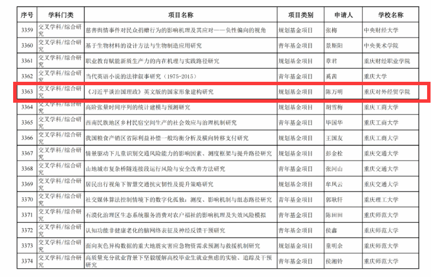 7月31日,教育部正式公布了《2024年度教育部人文社会科学研究一般项目评审结果公示名单》,外语外贸学院陈万明老师申报的《〈习近平谈治国理政〉英文版的国家形象建构研究》项目脱颖而出,成功入选“规划基金项目”!这标志着学校在国家级人文社会科学研究领域的又一重大突破,为学校科研事业增添了浓墨重彩的一笔。