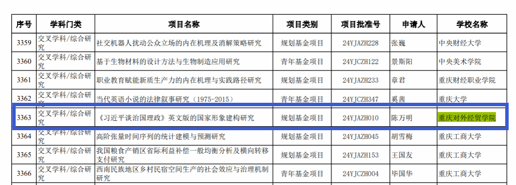 近日,教育部社科司公布了2024年度教育部人文社会科学研究一般项目立项名单,学校陈万明副教授主持的《习近平谈治国理政》英文版的国家形象建构研究》获规划基金项目立项,是教育部批准全国唯一以《习近平谈治国理政》英译本为研究内容的人文社科研究项目,学校在人文社科研究领域取得历史性突破!