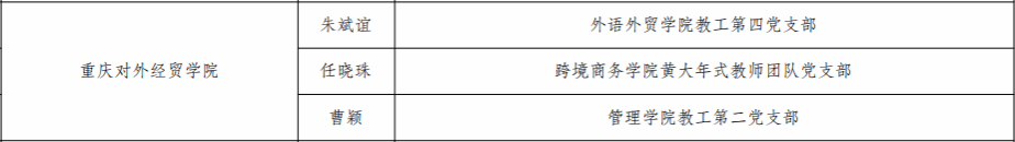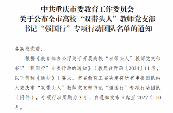 【本网讯】为创新落实立德树人根本任务,深入贯彻落实教育部党组关于高校“双带头人”教师党支部书记培育工作的部署要求,充分发挥高校“双带头人”的示范引领作用,引导广大师生在以中国式现代化全面推进强国建设、民族复兴伟业新征程上砥砺新担当、发展新作为,教育部组织开展了高校“双带头人”教师党支部书记“强国行”专项行动。学校党委持续加强“双带头人”教师党支部书记培育,以提升教师素质能力为核心的“强芯工程”与教师党支部书记“双带头人”培育工程有机结合,实现“双带头人”教师党支部书记全覆盖。威廉希尔官网朱斌谊、任晓珠、曹颖3位“双带头人”教师党支部书记入选了重庆市高校“双带头人”教师党支部书记“强国行”专项行动团队。