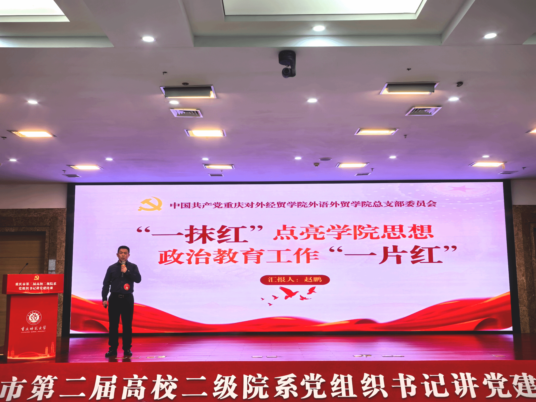 比赛中,赵鹏紧紧围绕党建统领事业发展,从“底色擦亮”行动,突出“红色领航”工程;“本色砥砺”行动,突出“红色铸魂”功能;“成色淬炼”行动,突出“红色先锋”作用;“特色厚植”行动,突出“红色基因”意蕴四个方面汇报了外语外贸学院党总支思想政治教育工作经验做法与成效。