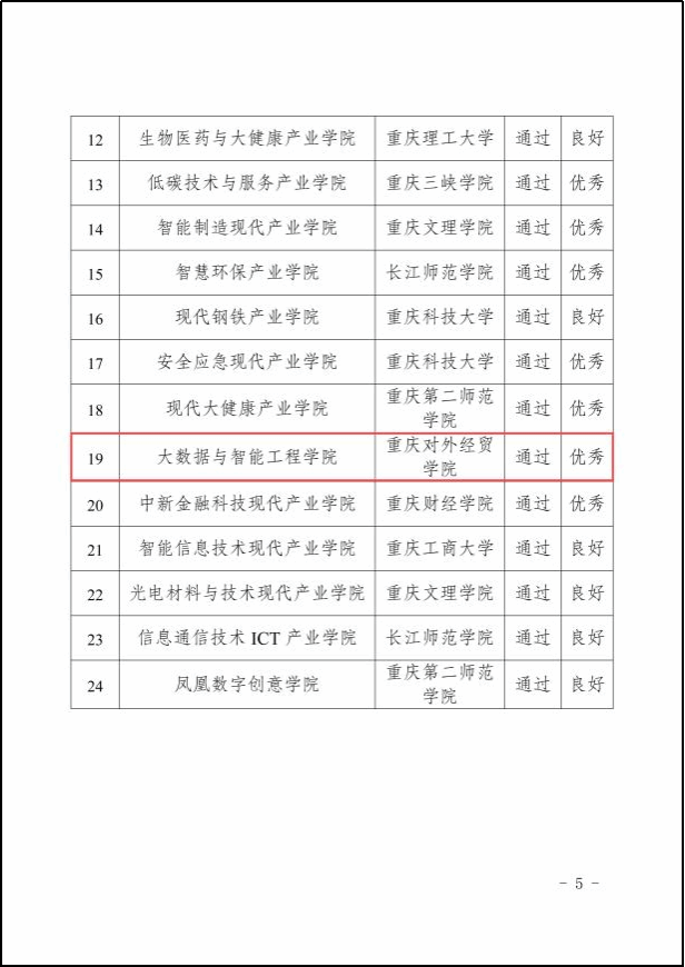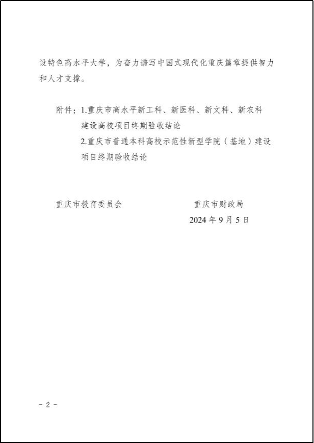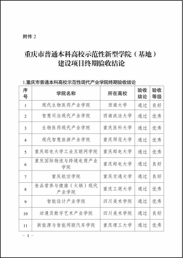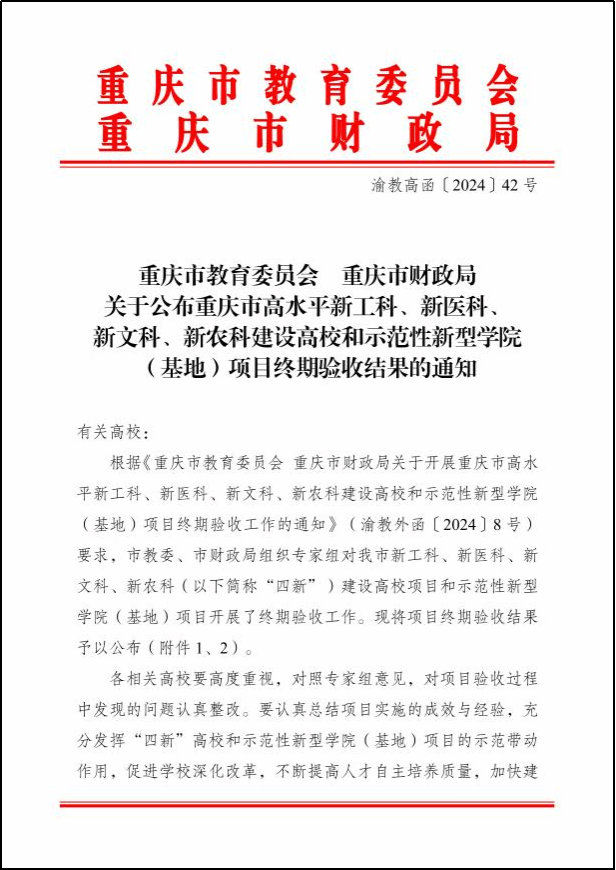 【本网讯】近日,重庆市教育委员会、重庆市财政局印发《关于公布重庆市高水平新工科、新医科、新文科、新农科建设高校和示范性新型学院(基地)项目终期验收结果的通知》(渝教高函〔2024〕42号),正式公布了重庆市普通本科高校示范性现代产业学院终期验收结论。学校大数据与智能工程学院作为重庆市普通本科高校示范性现代产业学院建设单位,继在中期验收时获评为“优秀”等级之后,再次以“优秀”等级通过市教委、市财政局终期验收。