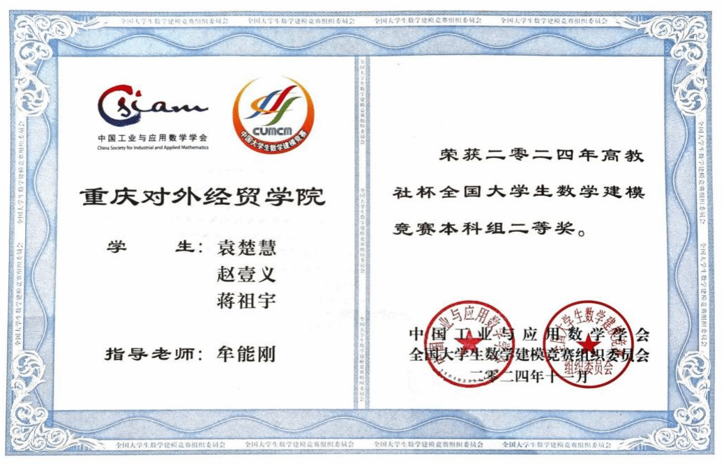 在全国大学生数学建模竞赛这一全国高校规模最大、影响力最强的基础性学科竞赛平台上,威廉希尔官网学子凭借出色的表现,荣获了全国二等奖1项,重庆市一等奖2项,重庆市二等奖3项。