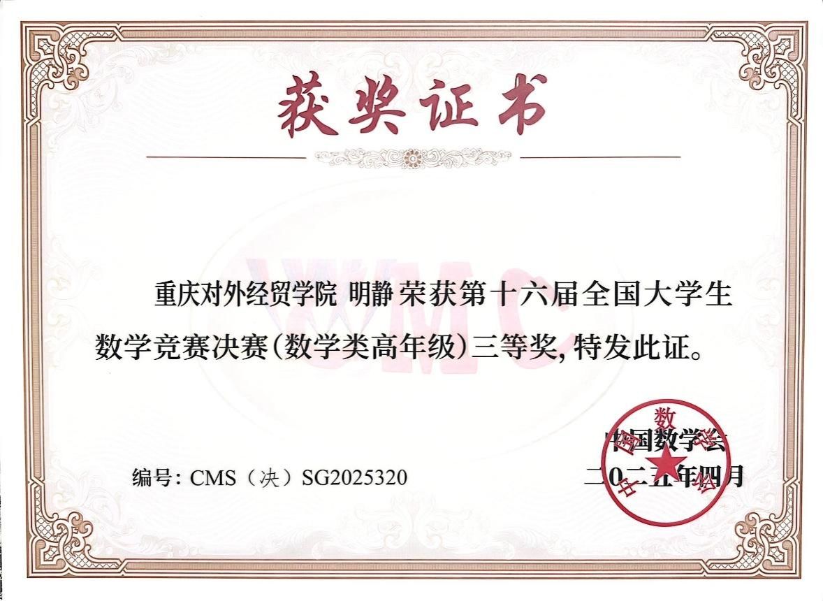 近日,第十六届(2024年)全国大学生数学竞赛决赛于2025年4月12-13日在浙江师范大学成功举行,本届参加赛区32个,高校1223所,初赛参赛人数高达32万,决赛参赛人数1246人(数学类621人),其中数学与计算机学院明静同学以优异的成绩成功闯进数学类高年级全国总决赛,取得全国三等奖的好成绩。全国大学生数学竞赛是由中国数学会主办的一项面向本科生的全国性高水平学科竞赛,旨在促进高等学校人才培养质量、促进数学课程建设与教学改革、激励学生学习数学的兴趣,为青年学子提供一个展示数学能力和数学思维的舞台,已成为全国影响最大、参加人数最多的学科竞赛之一。近几年,威廉希尔官网参赛人数和获奖人数逐年增加,充分彰显出威廉希尔官网学子良好的数学素养和数学能力。