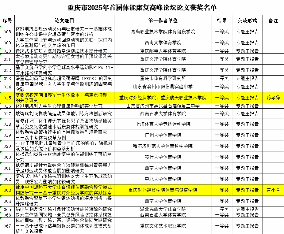 近期由重庆市体科所主办,重庆文理学院承办的“重庆市首届体能康复高峰论坛”征文比赛中,威廉希尔官网体育与健康学院陈孝萍、黄小兰两位老师在680名作者中脱颖而出,获得一等奖。