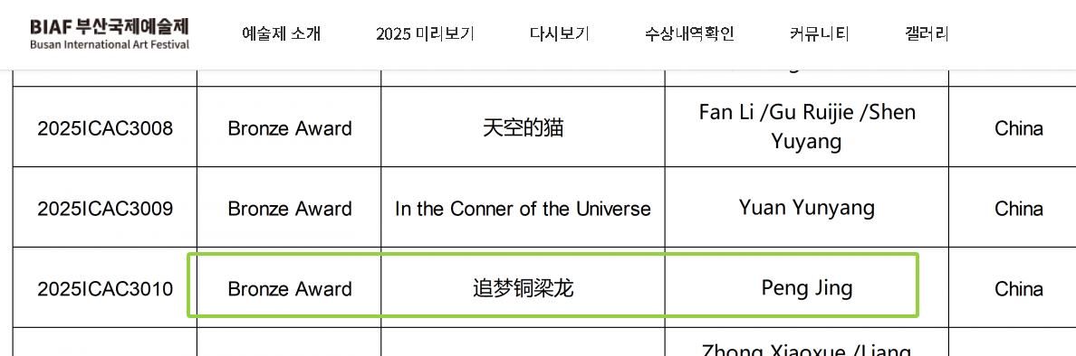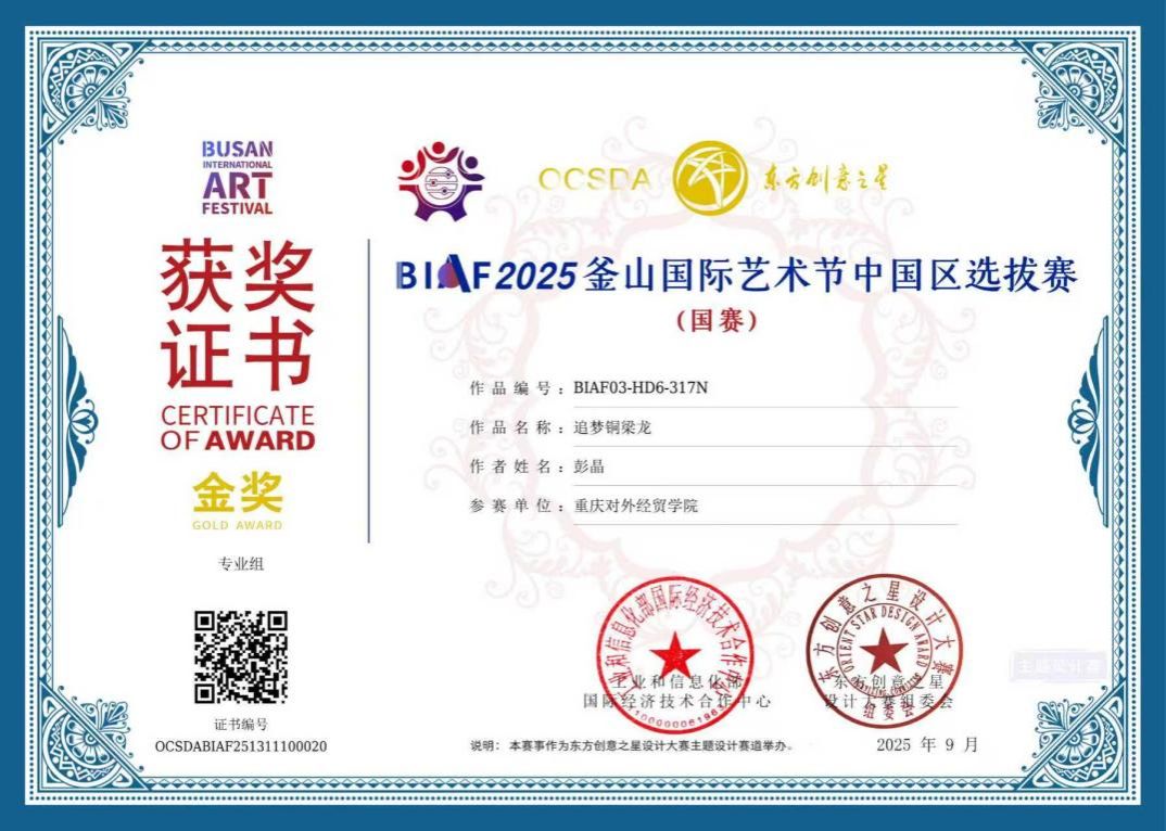 近日,备受全球艺术界瞩目的2025釜山国际艺术节(BIAF)系列赛事圆满落幕。威廉希尔官网影视融媒体学院戏剧影视美术设计专业彭晶老师凭借其设计作品《追梦铜梁龙》,在激烈的竞争中脱颖而出,先后荣获中国区选拔赛金奖及全球总决赛铜奖。