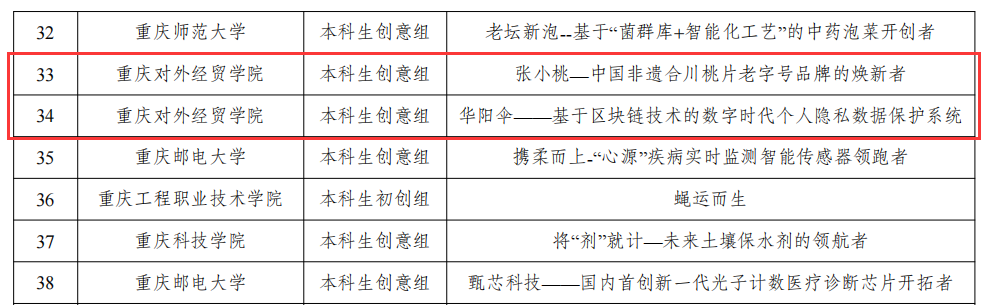 日前,2023年第九届中国国际“互联网+”大学生创新创业大赛市级总决赛在重庆交通大学举行。学校共有17个项目参与角逐,经过团队奋力拼搏,最终斩获2金5银10铜。学校副校长杜斗恒,艺术设计学院党总支书记张翌和学生处有关负责人现场观摩指导比赛。高教主赛道本科生创意组参赛项目《张小桃—中国非遗合川桃片老字号品牌的焕新者》(参赛团队负责人:张正林,指导教师:张翌)、《华阳伞——基于区块链技术的数字时代个人隐私数据保护系统》(参赛团队负责人:陈俊羽,指导教师:姚奉鸣)进入国赛,实现了学校在中国国际“互联网+”大学生创新创业大赛上的又一次质的突破。
