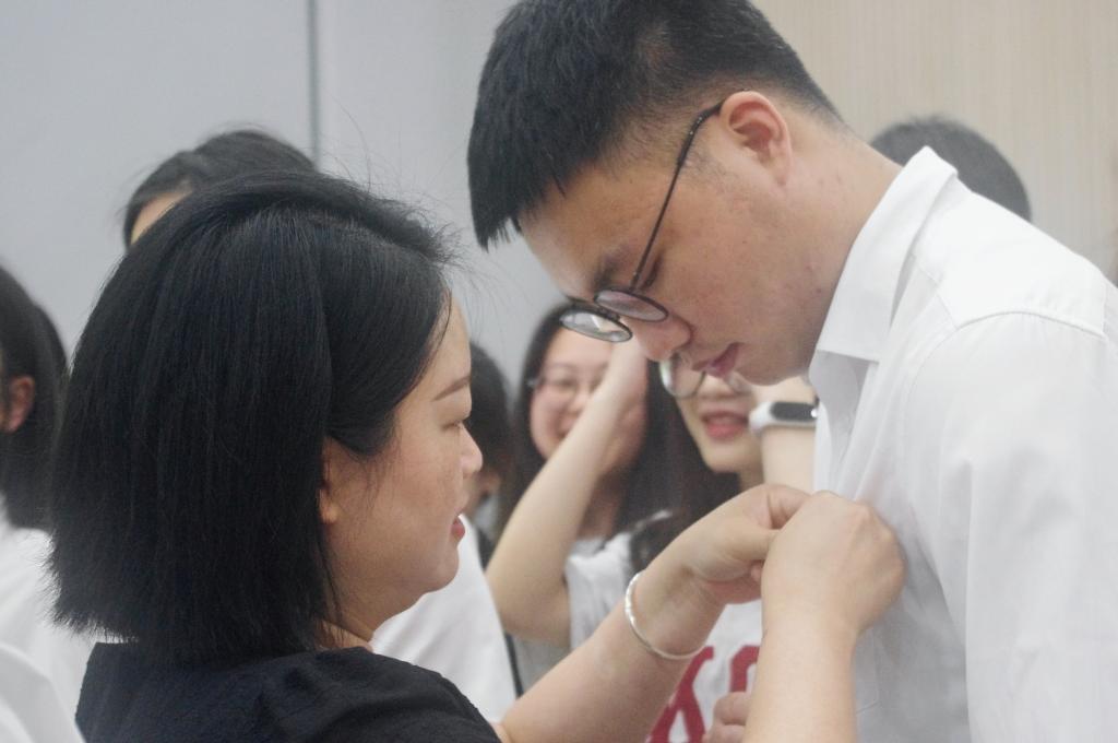 在庄严的《国际歌》中,宣誓仪式拉开了序幕。党永春同志宣读了新党员名单,朱丽婷同志带领44名新党员面向党旗庄严宣誓。宣誓结束后,正式党员为新党员们佩戴党徽,并送上政治生日寄语贺卡。紧接着新党员代表魏文军同志发言,她说到共产党员不只是一种身份,更是一种责任。每一位新党员都应该切实地继承和领会革命先进的光荣传统,用实际行动去实现在党旗下的誓言。随后,何杨波同志代表学院党总支对44名新党员加入党组织表示祝贺。他希望新党员们铭记入党誓言,并提出两点要求:一是熟背党章,牢记于心,时时刻刻严于律己;二是关心学院发展,理性客观看待问题,勉励新党员们在接下来的时光里,要用实际行动践行诺言,为党旗增光添彩,为党和人民的事业奋斗终生。
