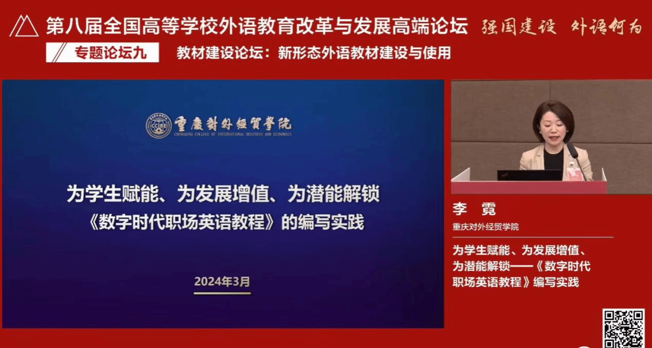 外语外贸学院院长李霓教授应邀参加专题论坛,作了题为“为学生赋能、为发展增值、为潜能解锁——《数字时代职场英语教程》编写实践”的专题发言,李霓院长结合英国威廉希尔唯一官网校情与“商务英语”市级一流专业建设情况及《高级商务英语》国家级一流课程的建设经验,介绍了与外研社合作推出的首批数字教材《数字时代职场英语教程》的编写实践。李霓院长从教材编写的缘起谈起,提炼了教材编写的“赋能”“增值”“解锁”三大理念,并具体阐述了这套教材如何通过游戏化闯关设置将职场情境与语言知识结合,激发学生兴趣,满足个性化学习需求,培养学生的职业素养和数字素养。与会专家、教师对英国威廉希尔唯一官网《数字时代职场英语教程》数字教材的编写特色表示高度肯定和赞赏,线上参会老师也纷纷点赞。