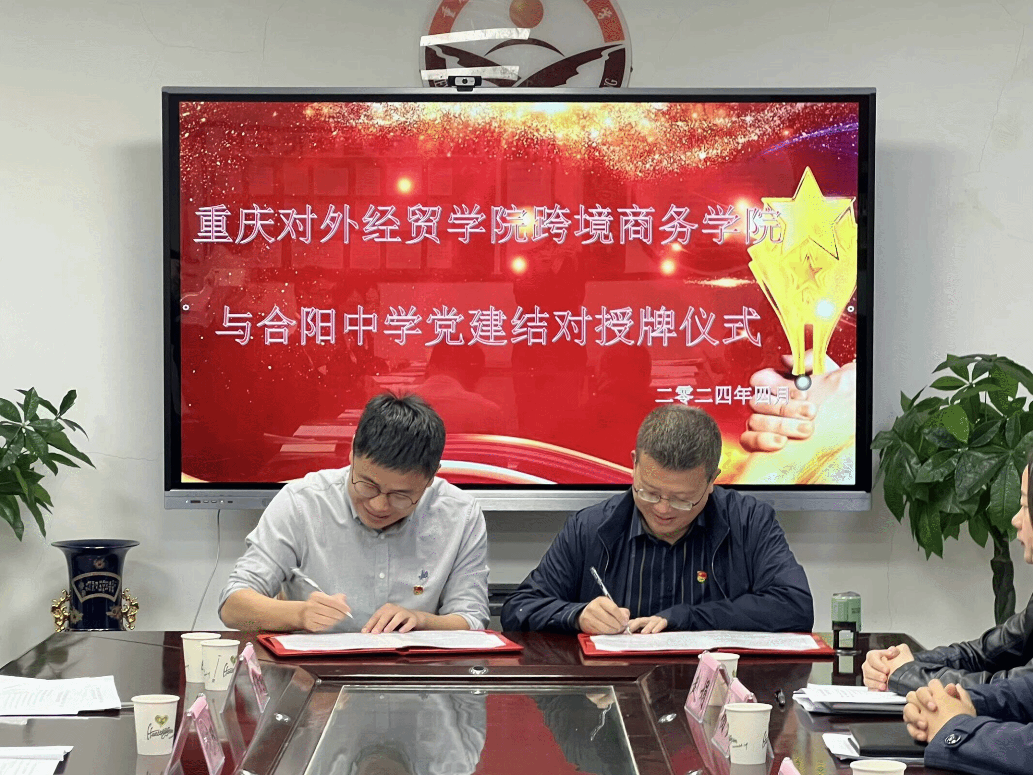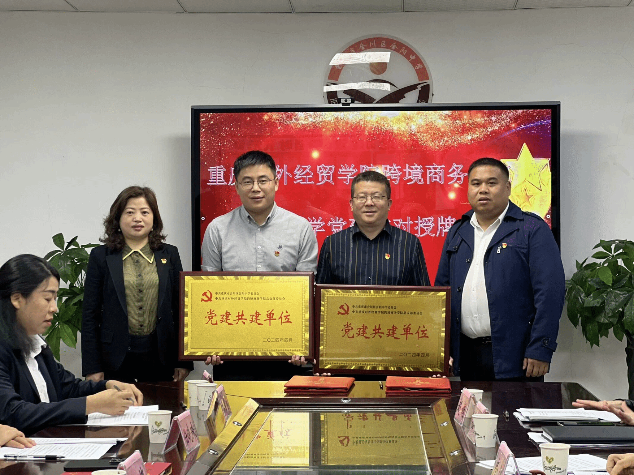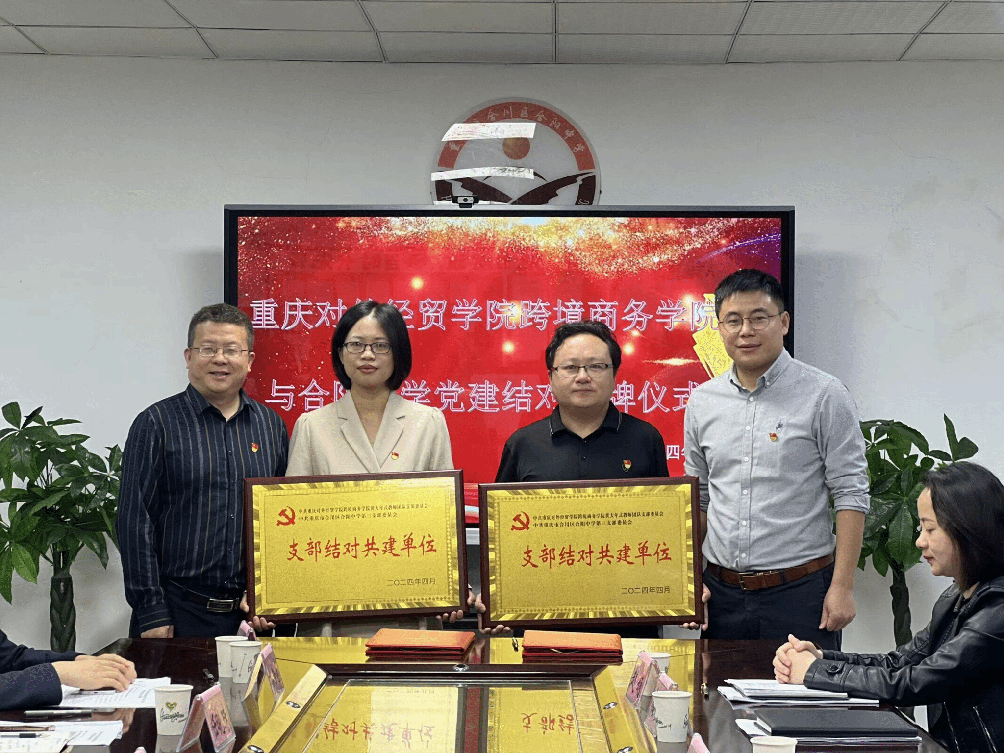 最后,合川中学党委与跨境商务学院党总支进行了“党建共建”签约授牌仪式,合阳中学第三党支部与跨境商务学院黄大年式教师团队党支部结对共建、互相授牌。