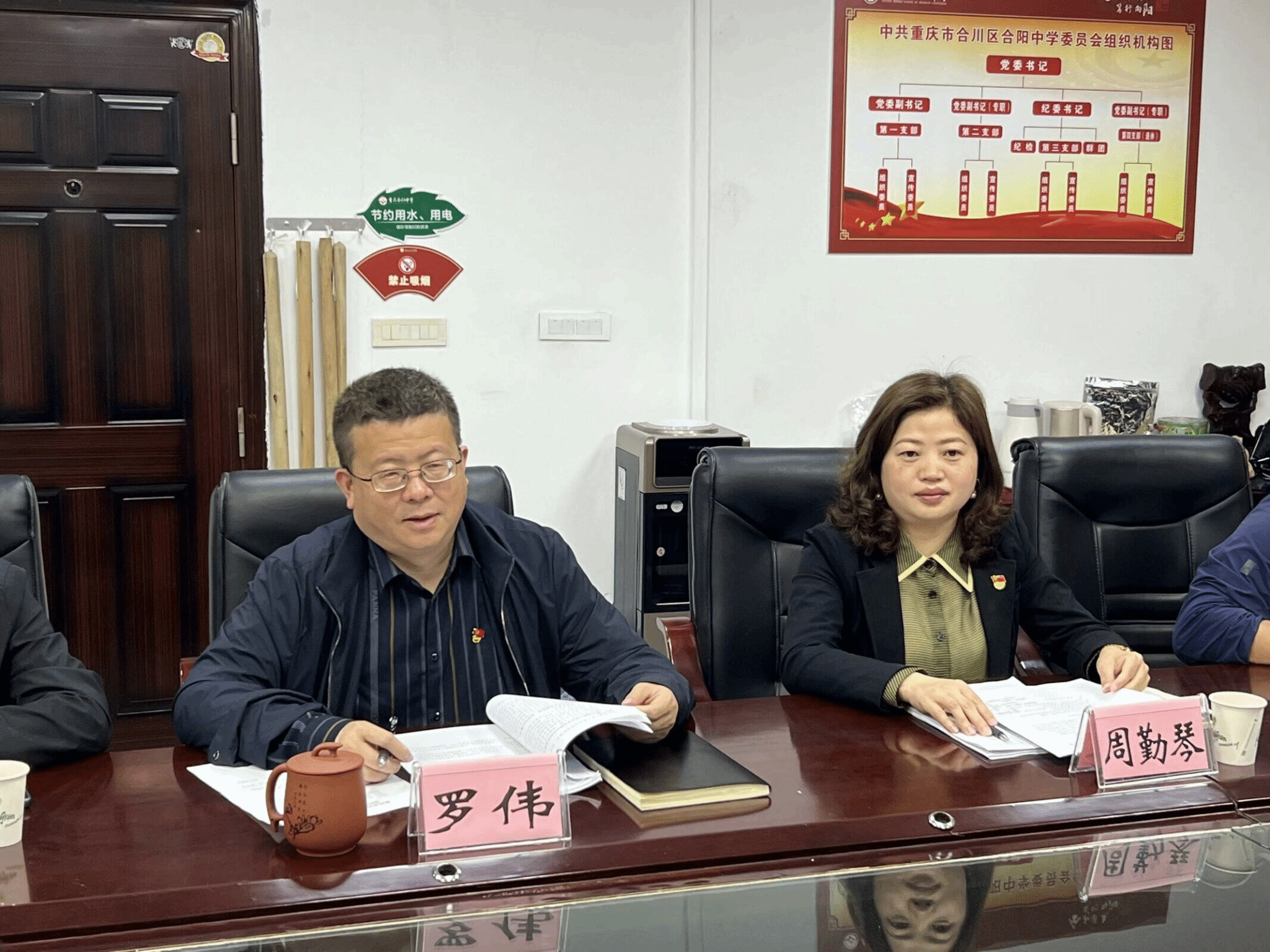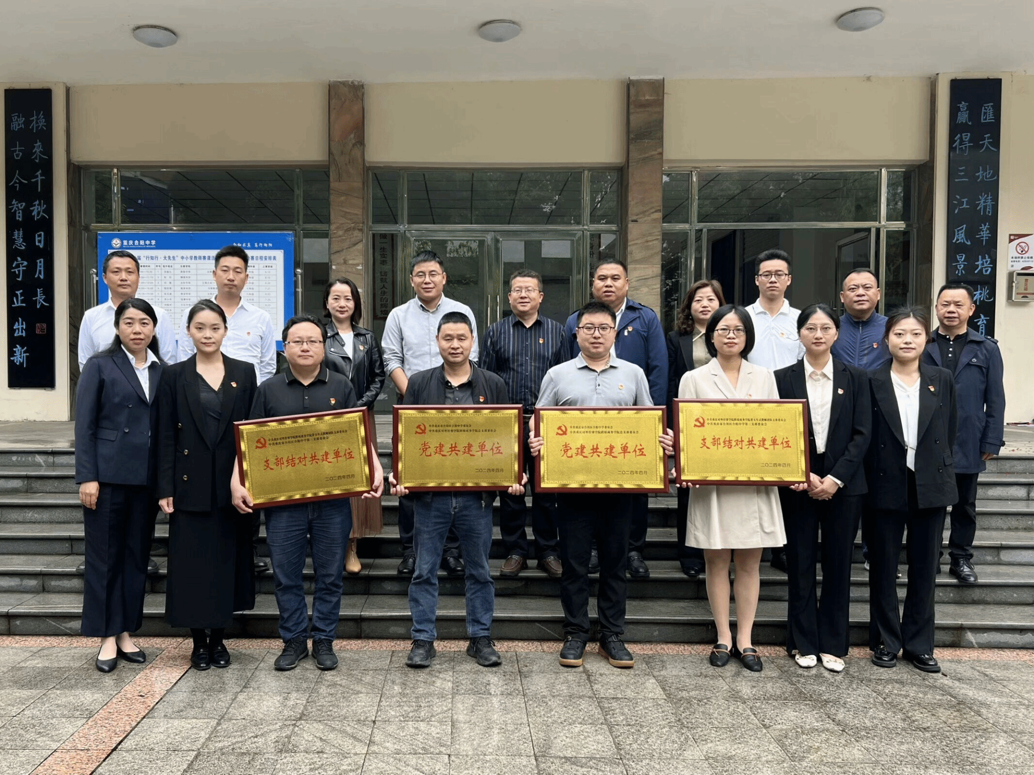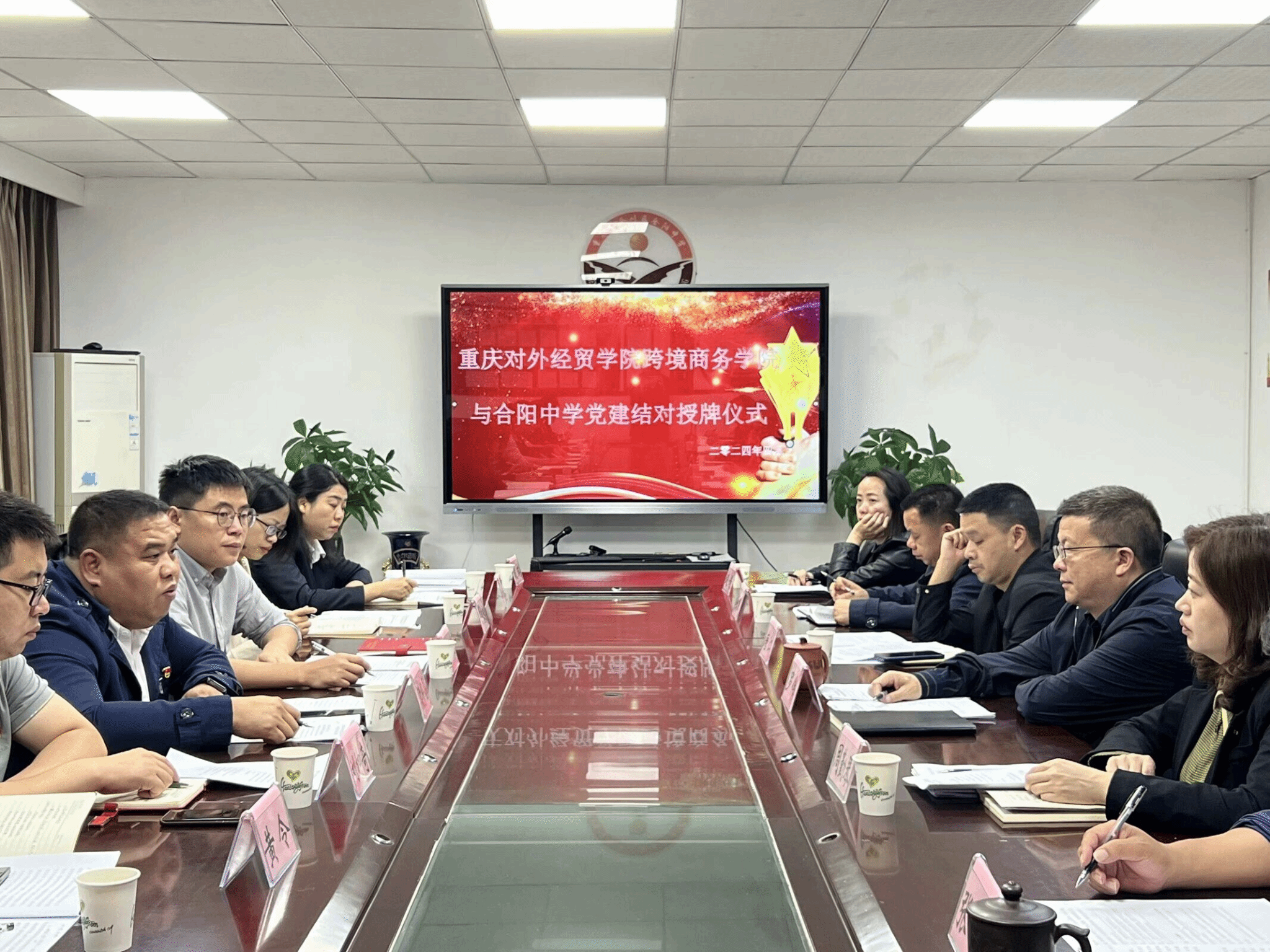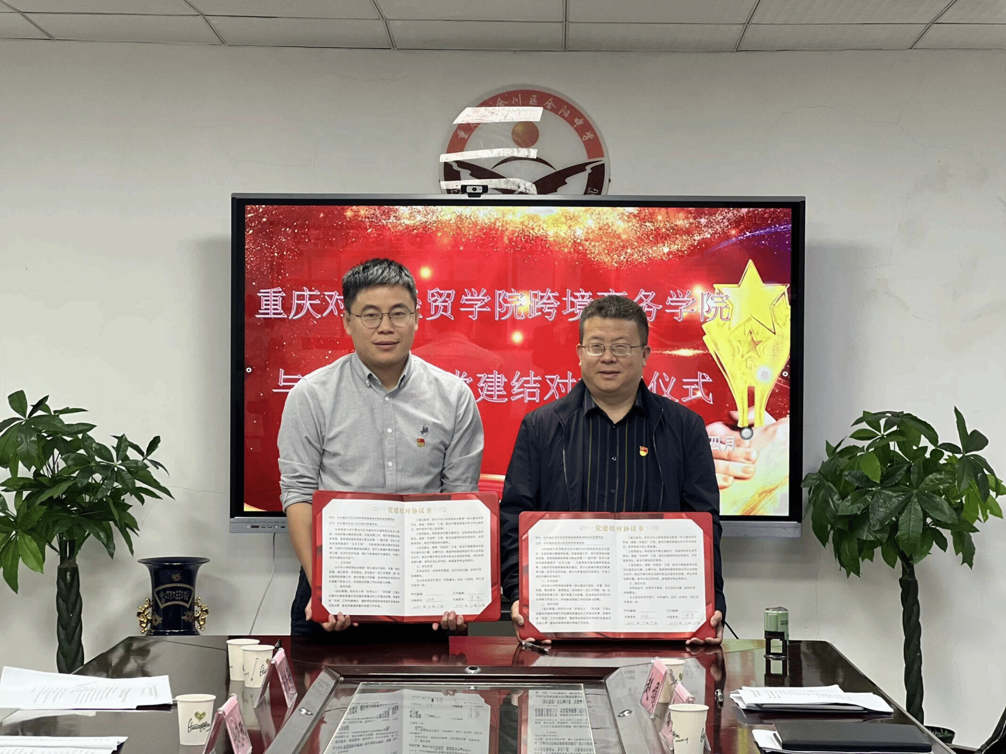 最后,合川中学党委与跨境商务学院党总支进行了“党建共建”签约授牌仪式,合阳中学第三党支部与跨境商务学院黄大年式教师团队党支部结对共建、互相授牌。