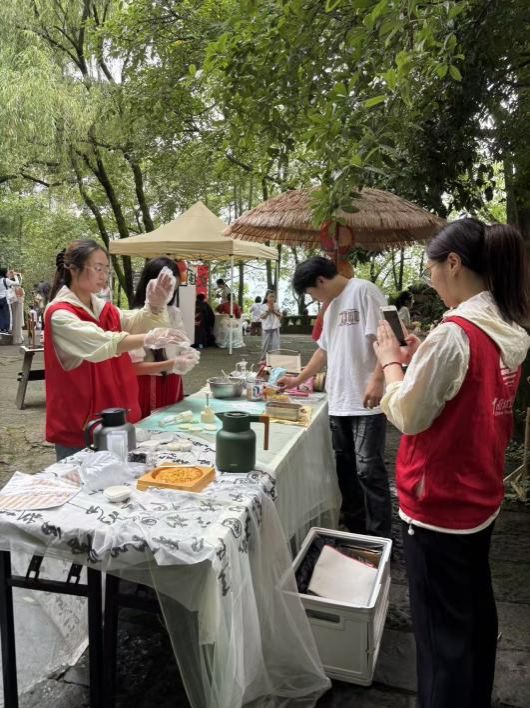 时值国庆旅游高峰,景区游人如织。活动中,同学们身着汉服,亲身沉浸于钓鱼城深厚的历史文化氛围之中,其古典风韵也为景区增添了独特的活力与风采。同时,学生志愿者团队在护国坪专门设立了文化体验区,面向广大游客提供书法展示、宋代点茶技艺演示与品茗交流等富有传统文化特色的讲解与体验服务。这一系列互动不仅丰富了游客的游览体验,更锻炼了学生的组织协调、文化讲解与现场服务能力。