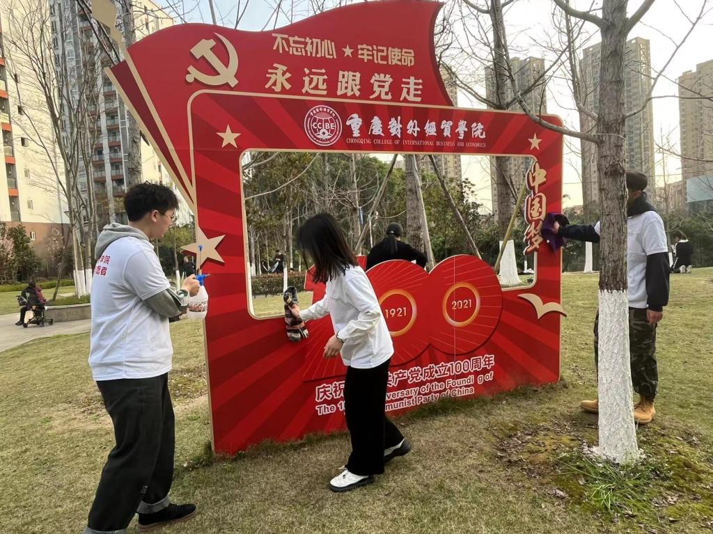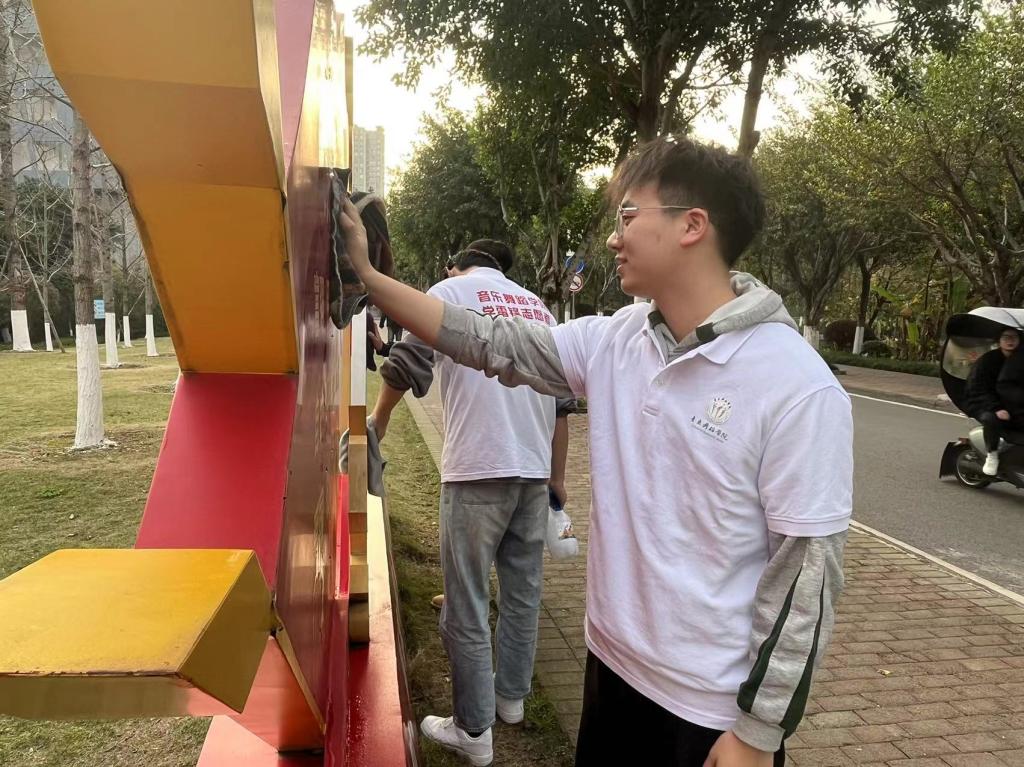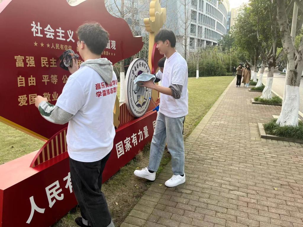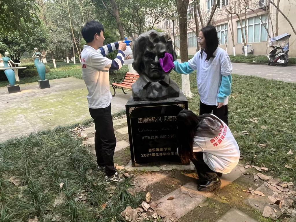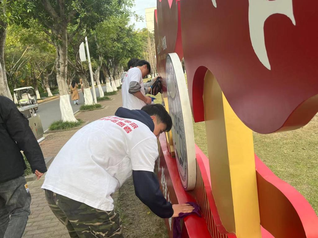 (志愿者们正在对校园精神文化建筑进行清洁)