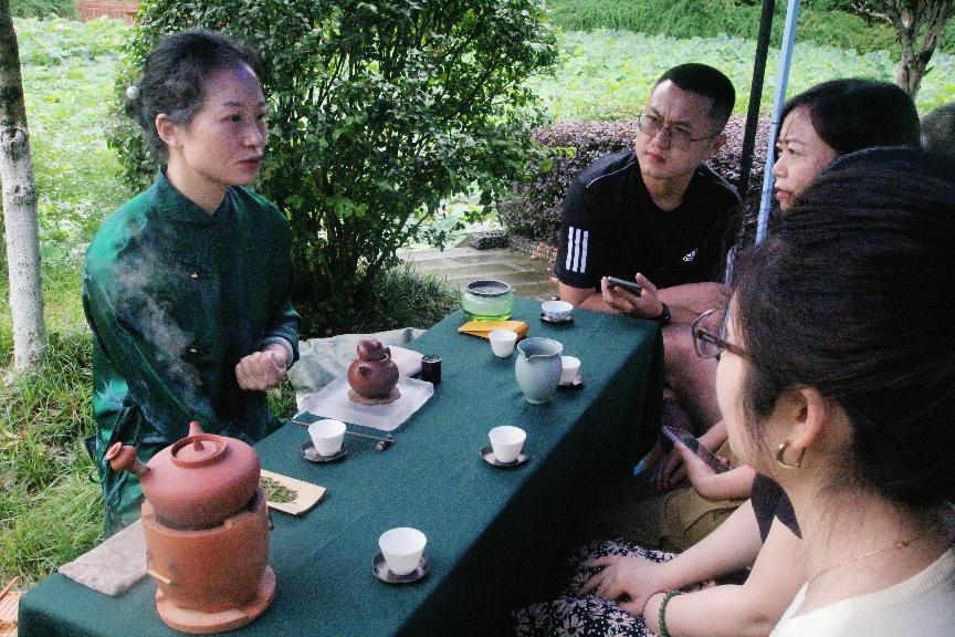 茶会现场,特约嘉宾合川区茶业协会副会长赵刚、茶专家温纯,校工会茶艺小组组长国家级茶艺师张英、茶艺爱好者刘杨分别为工会会员分享了茶艺知识,详细地向与会人员介绍茶叶的种类及相关知识,并现场示范茶席设计、功夫茶冲泡技法,讲解操作流程。