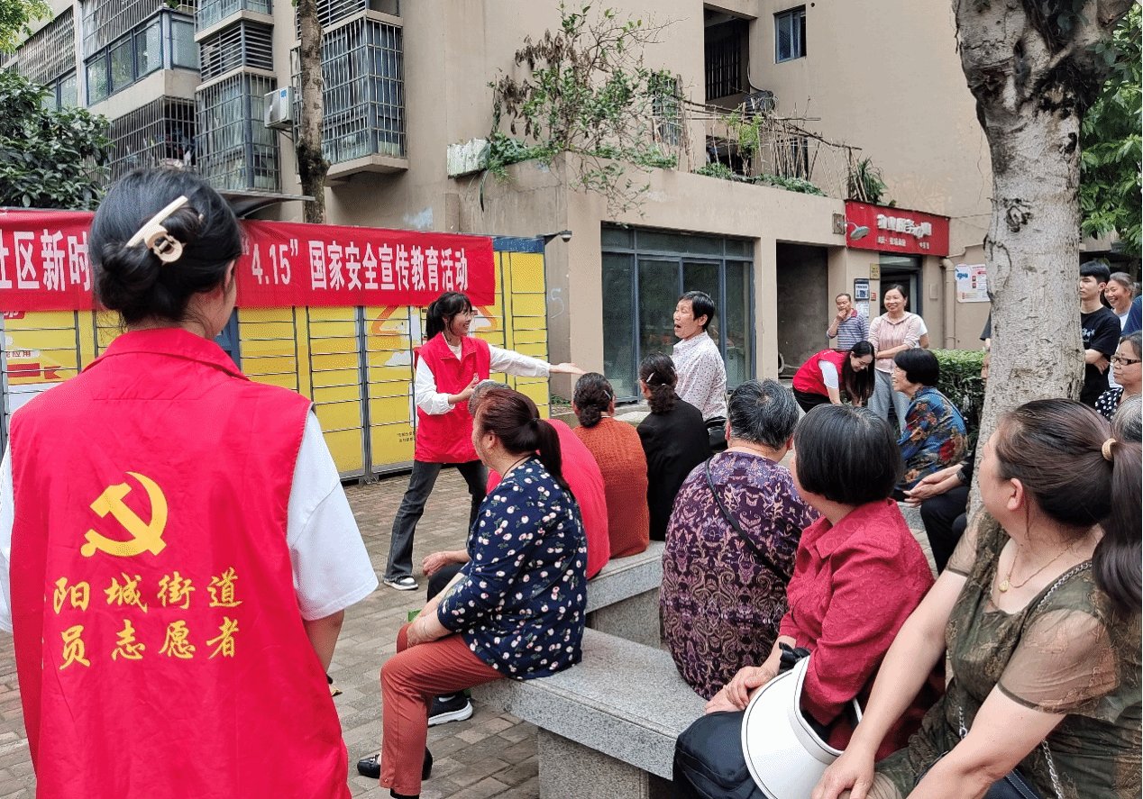 (图为“国家安全教育日”活动志愿者与社区居民互动)