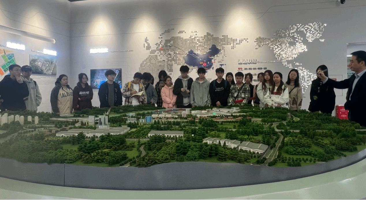 当日,游学团一行先参观了果园物流枢纽的多式联运示范基地。在这里,示范基地负责人向同学们详细的介绍了我市多式联运的发展历程与成就,并通过沙盘展示了依托地理优势构建的公、铁、海联运模式。这种创新运输模式整合了不同运输方式的优势,打破传统物流局限,实现了货物的高效、便捷、低成本运输,使同学们直观感受到了多式联运在国际贸易中的关键作用。